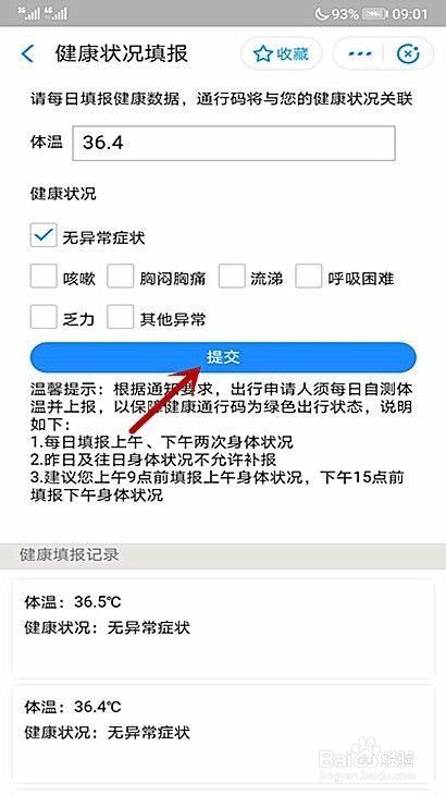 填写健康状况,点击“提交”;提示填报成功,点击“确定”即可。