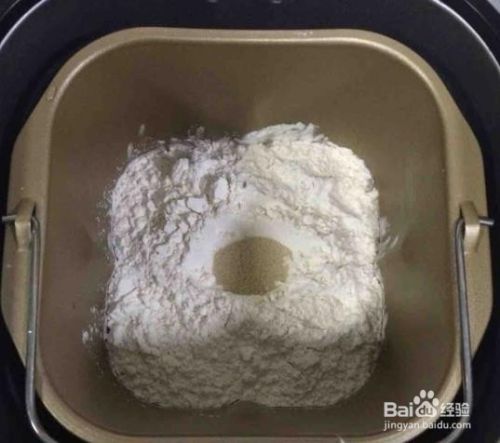 继续加入高筋面粉,在面粉中间挖了洞,把酵母粉放入。