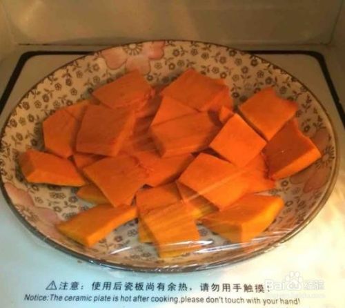 用微波炉加热南瓜,建议加热一分钟后取出南瓜翻个面,再继续加热,并且检查南瓜熟的程度。