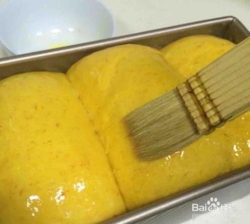 在发好的吐司面团上刷上黄油(也可以刷鸡蛋液,或者省略不刷均可)。
