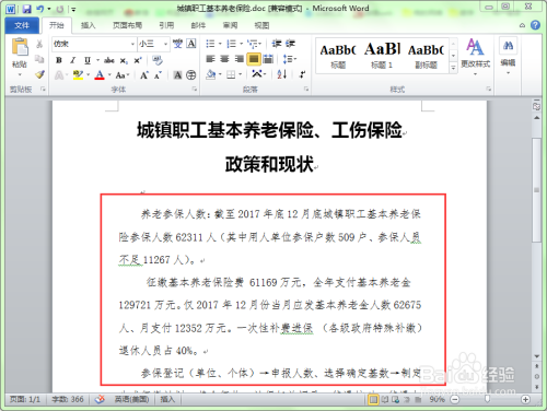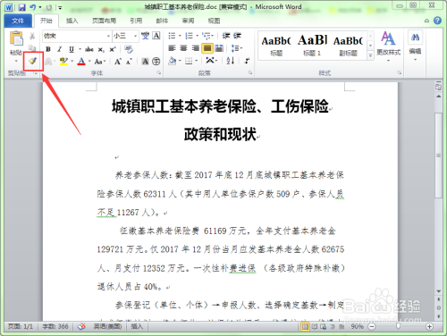 先在第一个自然段中选择任意几个文字(一个文字也行),然后点击“开始”菜单选项卡中的“格式刷”按钮。