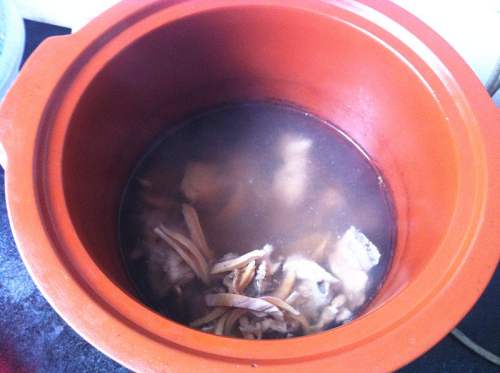 44,砂锅倒入适量清水,放入排骨和墨鱼丝,大约煮一小时左右。
