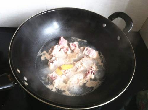 33,将排骨冲洗干净,坐锅,烧热水,放入排骨和生姜片,焯烫一会儿去除血水,捞出。撇去油沫,先后将胡萝卜块和黑木耳也焯烫一下。