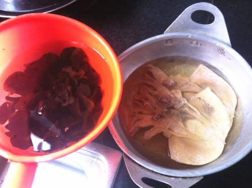 11,墨鱼干、黑木耳提前浸泡,充分泡发。