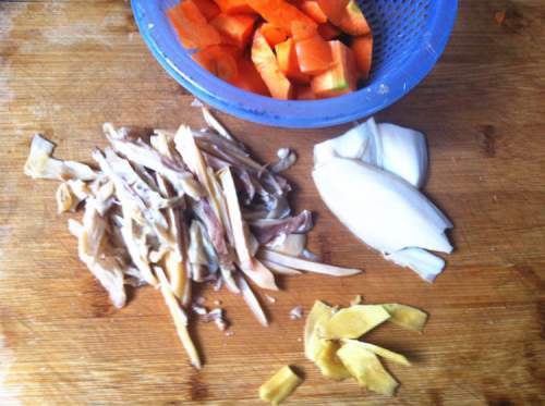 22,泡好的墨鱼干去骨,切细丝,胡萝卜切小块,生姜切片。