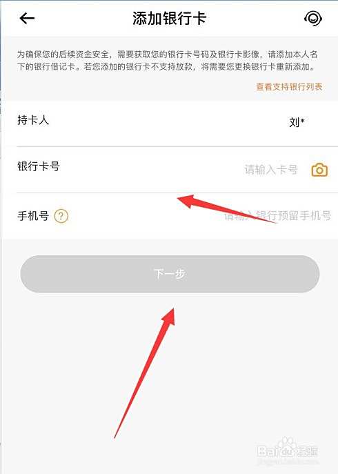 然后,输入银行卡卡号和预留手机号后,点击“下一步”