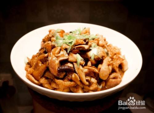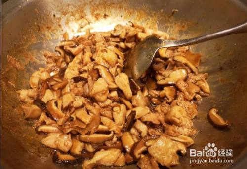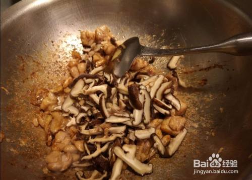 加入鸡肉、老抽翻炒,放入香菇丝继续翻炒;
