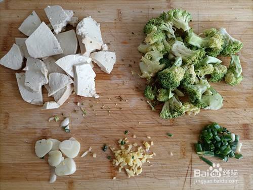 把豆腐洗净切成块,西兰花洗净掰成小朵,葱切葱花,姜切末,蒜切成片。