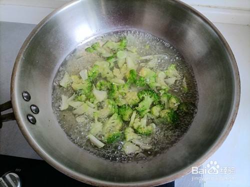给煮锅里倒入半锅水,大火把水烧开,放入西兰花焯水后捞出。