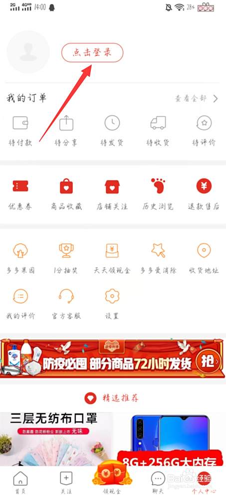 打开【个人中心】后,点击左上方的【点击登陆】,登上自己的拼多多账号,就可以修改自己的个人信息了。