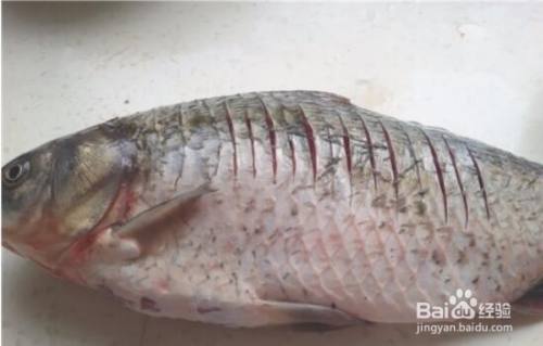 2.草鱼去鳞、内脏和腮,冲洗干净,沥净水分,在两侧划上几刀;准备好配料。