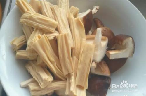 鲜香菇用清水浸泡去泥沙,切成小块;腐竹至少提前2小时泡发,剪成段。