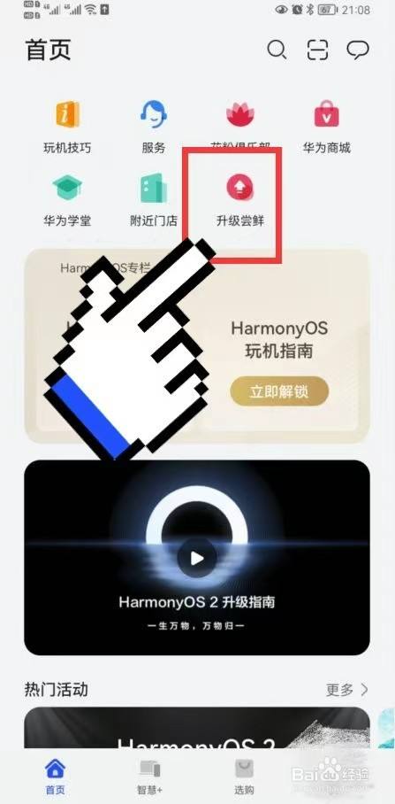 打开手机我的华为应用软件,在打开页面选项升级尝鲜选项