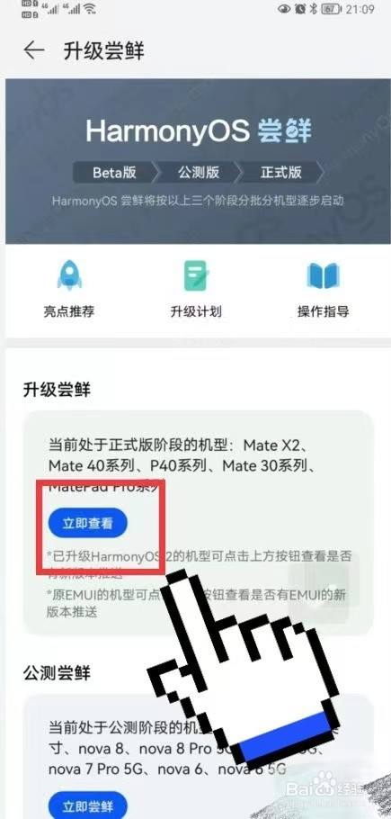 在升级尝鲜页面找到立即查看按钮,点击进入