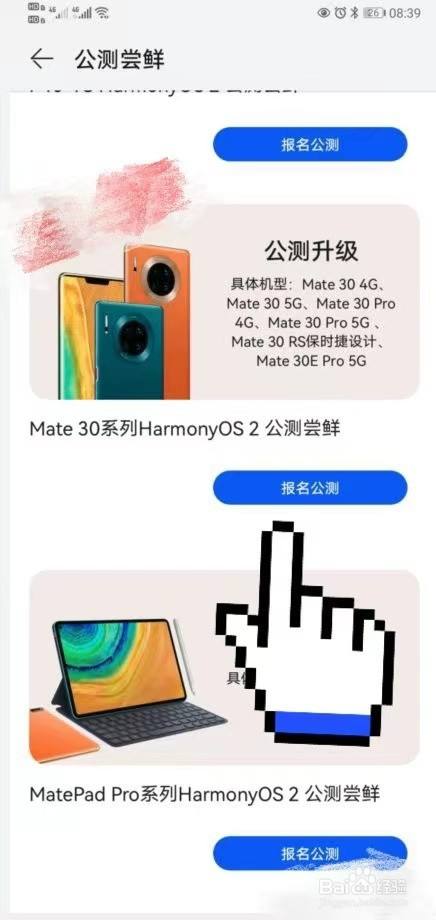在公测尝鲜页面找到要升级mate20型号,点击报名公测