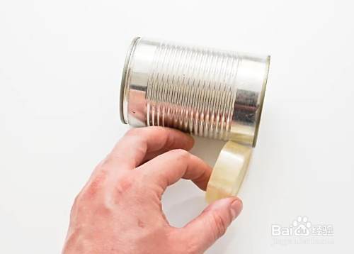 用胶带绕着罐头。用手将它们紧紧地压在罐头上。轻轻地揉搓胶带,把粘胶转移到罐头上。