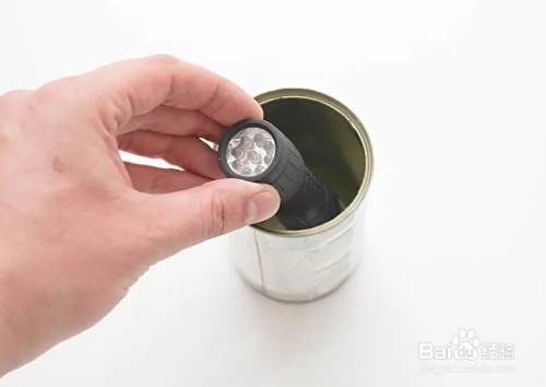 用胶带将一个小小的手电筒贴在罐头盖子底下。将盖子贴在手电筒底部。这也是捕蝇器的底部。最好使用紫外线手电筒,因为苍蝇最容易受紫外线吸引。