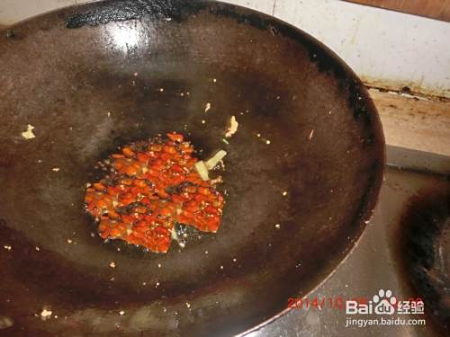 锅中热油加入干辣椒丁,花椒料,炒香。