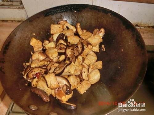 将豆腐倒入锅中,加姜片、香菇丝、苟杞、酱油、孜然粉、咖喱粉和水拌均,盖上锅盖炖。