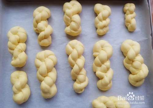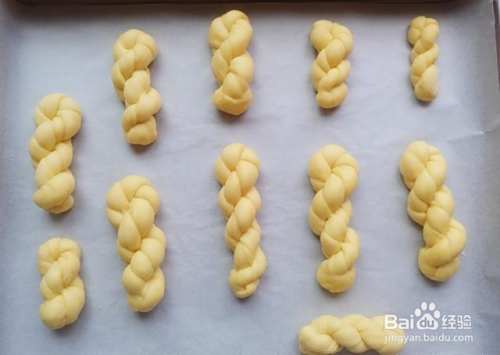 再次对折,继续像拧麻花一样扭转起来,收口处要捏紧实,避免发酵的时候涨开,由此我们的麻花造型就做好了。剩下的面条依次操作整形