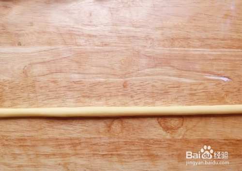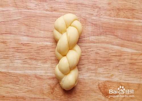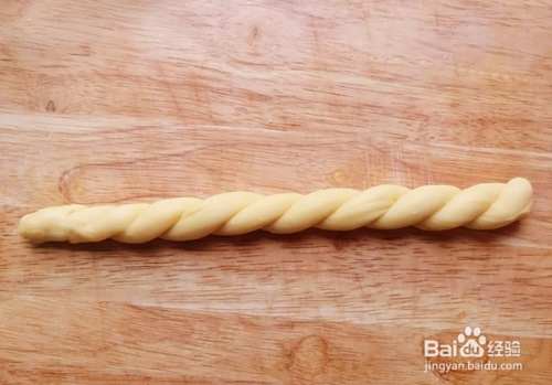 然后将搓好的长条对折,再扭转在一起,如图所示,扭转好后收口处要捏紧