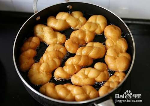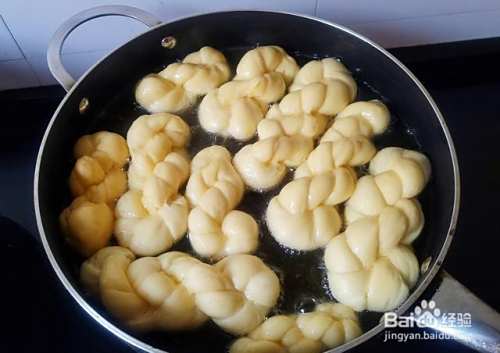 锅内倒入半锅食用油,大火将油温烧到8成热后,将生胚挨个下锅,用小火来炸,油炸期间记得用筷子多次翻动麻花,好让两面受热均匀