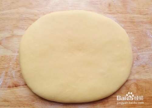 15分钟后,将松弛好的面团移到揉面板上,揉面板撒少许面粉防粘,把面团擀成1cm左右厚的片状