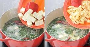 放入切块的豆腐,焯烫后的笋块,改成中火煮5分钟。