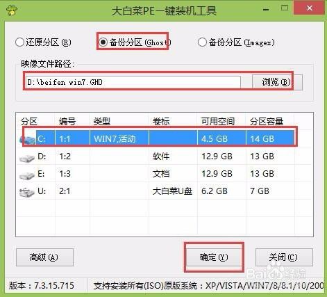 打开桌面上的pe一键装机工具,点击“备份分区”,选择要备份的系统盘(通常是c盘),然后再选择一个磁盘存放这个系统镜像文件,点击确定。