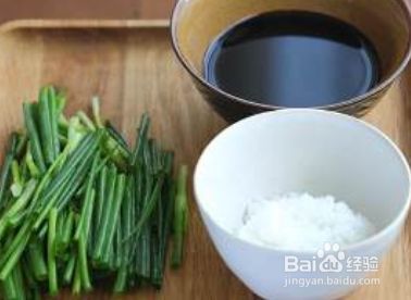 小葱洗净,切掉葱白部分不要,绿叶部分切成长段;生抽与老抽混合