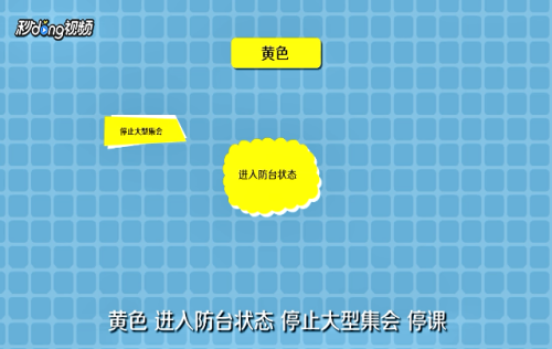 2蓝色做好防台准备,关注台风动态;黄色进入防台状态,停止大型集会,停课。