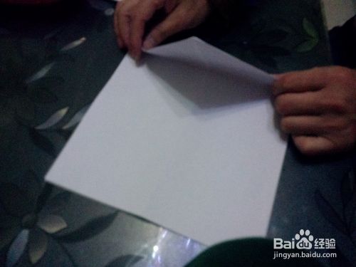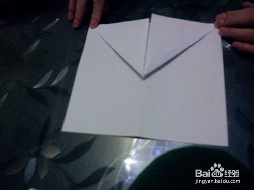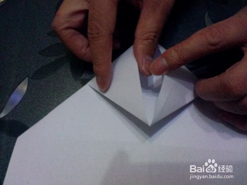 将三角形一端的短边沿中心线对折短边的两个角成三角形,再次翻转过来,使小菱形向上。