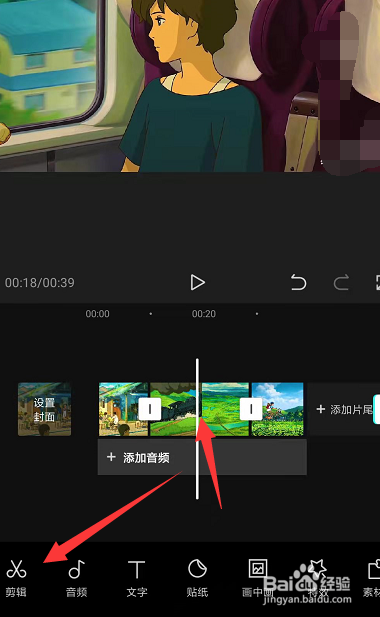 将新版手机剪映打开置入视频素材文件,在底部操作栏中选择剪辑选项