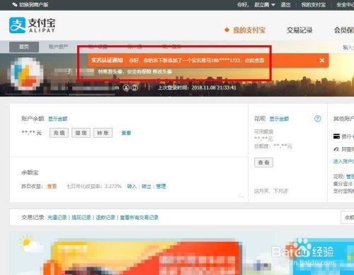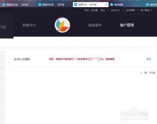 进入电脑板支付宝个人首页,可以看到有消息提示【实名认证通知】,提示我名下新添加了一个实名账号,点击查看。