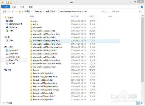 因为本人演示的是国行4G版NOTE2,所以此文件夹下会存在大量分辨率分类的文件夹,其他手机理论上不会出现这么多文件夹,文件夹分辨率识别如图所示。(N7108D由于分辨率较大,故选择的是drawable-sw359dp-xhdpi和drawable-sw359dp-xxhdpi两个文件夹进行处理,其他手机理论上只有自己分辨率的文件夹)