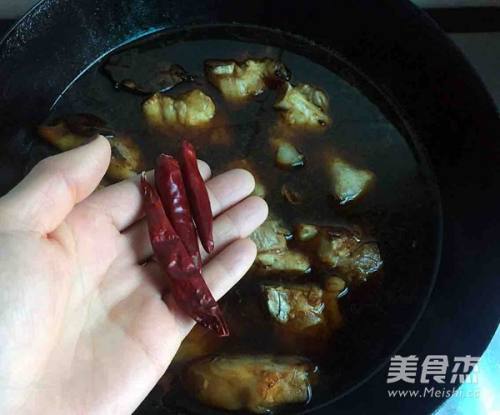 6加入漫过猪手的热水,调入生抽、老抽,撒几个辣椒