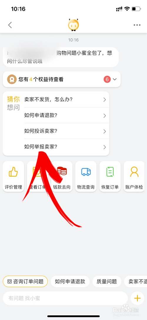 在进入聊天页面里,点击猜你想问的”如何举报卖家“。