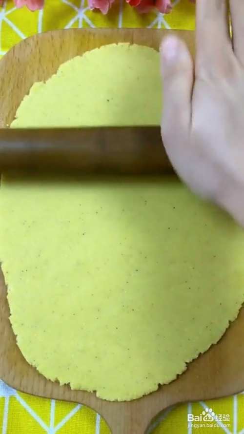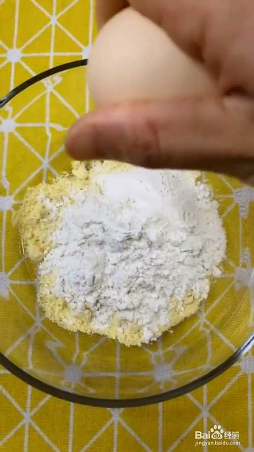 在碗中放入100g的玉米面粉,50g的白面粉,打入一个鸡蛋,不用加水,和成光滑面团。