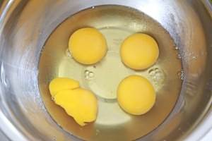 将4个鸡蛋打入打蛋盆中,鸡蛋一定要用常温的,不然不容易打发。