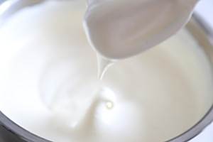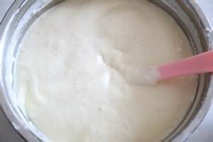 蛋液混合均匀后,使用高速,将蛋液打发至硬性发泡,即提起打蛋头蛋液呈不弯曲的尖状就可以了。