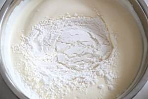 蛋液打好后,加入提前过筛好的低筋面粉,然后用橡皮刮刀从下至上翻拌的方式拌匀面糊,如果有不容易拌开的颗粒,可将面糊铲起,用橡皮刮刀在盆壁上轻敲,从而震开干的面团。