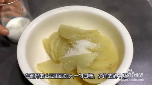 在蒸好的土豆里面加入一勺白糖,少许的鲜牛奶,用叉子将土豆捣成土豆泥。