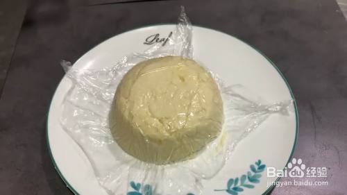 准备一个小碗铺上保鲜膜,把土豆泥倒在碗里面,用盘子将碗倒扣过来,取掉上面的碗,撕下上面的保鲜膜。
