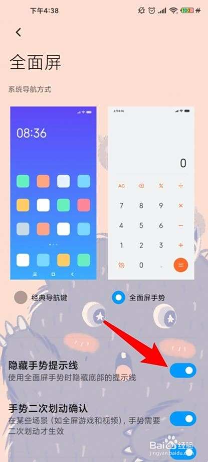 滑动隐藏手势提示线后的开关,这样底部小白条就设置好了。