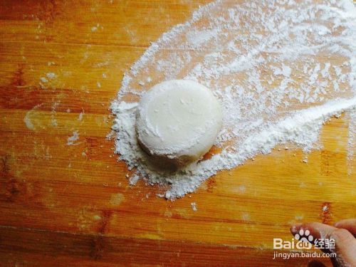 将面团粘上些面,正反面都粘上些面,准备开始擀饼。