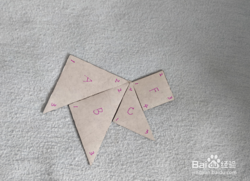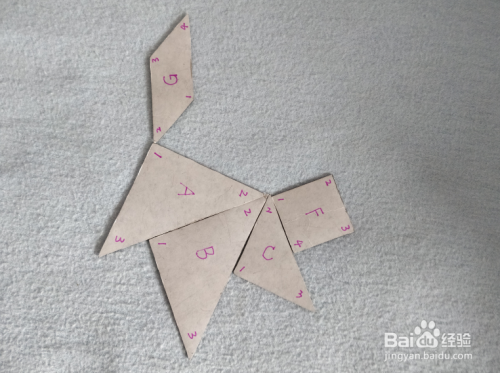 把D放在F的右上挨着,1在左,2、3在右,D的1、3分别挨着F的2、3,如图。一只活泼的小猫就完成了。