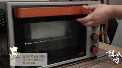 4盖保鲜膜放进烤箱,底下放一盆热水,发酵至9分满,放进预热好的烤箱,180度烤45分钟,取出切片,抹上果酱。