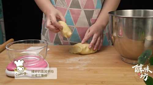 3揉好的面团平均分成三等份,擀开成牛舌状卷起,压扁再擀开卷起,放入吐司盒中。