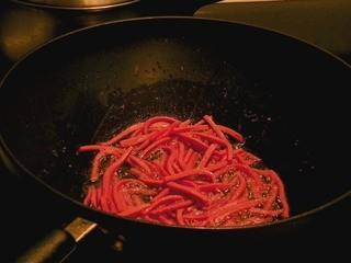 不够咸时可在锅边攒1-2茶匙生抽,加放肉丝、蒜苗和韮菜,翻炒均匀