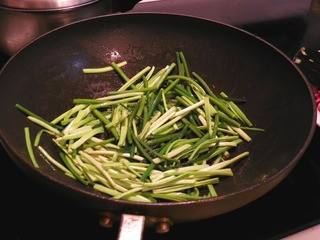 另起锅,将蒜苗和韮菜花稍炒至半熟,盛起备用